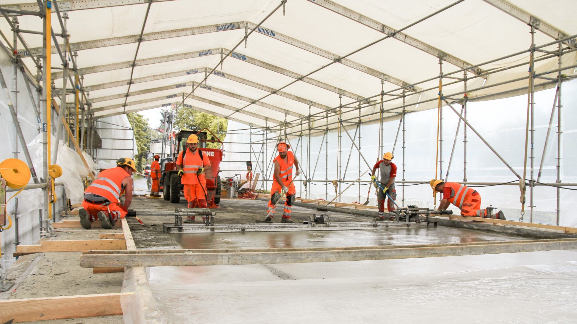 Ausführung eines Fahrbahnbelags mittels UHFB durch die ERNE decon AG. Bisher wurden lediglich Abdichtungen und Gehwege mit zweischichtigem UHFB durch die decon erstellt.